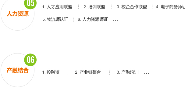 人才应用联盟:联合会长企业和会员企业建立人才库,实现人才资源共享,给人才足够多的选择空间和发展空间,帮助应届毕业生提供职业培训,并输送到会员企业或其他有需求的企业中去工作。必要的时候可组建人力资源公司,猎头公司。